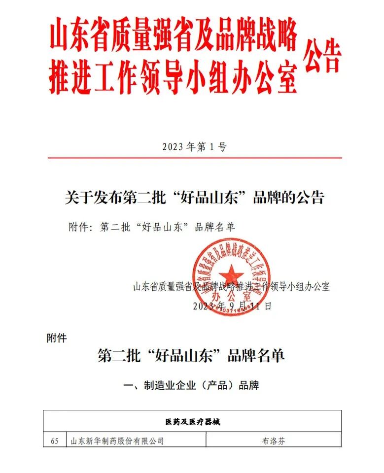9月12日,由山东省市场监督管理局会同省委宣传部、省发展改革委、淄博市政府共同主办的山东省2023年“质量月”启动仪式在淄博举行。活动发布了第二批“好品山东”品牌名单,新华制药布洛芬成功入选。