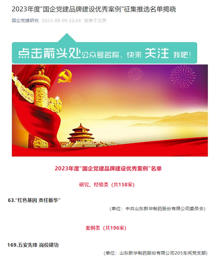 8月9日,由中国企业改革与发展研究会担任指导单位、中国企业管理研究会企业党建研究院担任支持单位、《国企》杂志主办的2023年度“国企党建品牌建设优秀案例”征集推选活动圆满落下帷幕。新华制药党委“红色基因、责任新华”和205车间党支部“五安先锋、岗位建功”分别入选2023年度“国企党建品牌建设优秀案例”研究经验类和案例类名单。